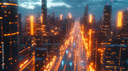 Fototapeta premium Futuristic city skyline with glowing buildings and vibrant lights