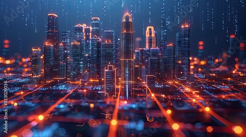 Obraz premium Futuristic City Skyline with Glowing Digital Grid and Skyscrapers at Night