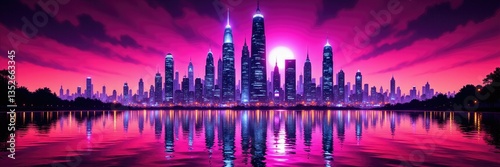 Fototapeta premium Futuristic city skyline with glowing purple lights and dramatic reflections...