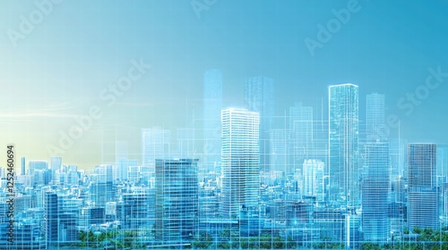 © Phunnada, Obraz premium Futuristic City Skyline with Modern Glass Buildings Against a Blue Sky at Sunset