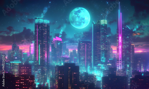 © Putu, Fototapeta premium Futuristic city skyline with neon lights at night.