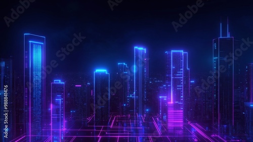 Fototapeta premium Futuristic city skyline with neon lights, dark background.