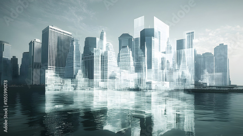 © Pangsiri, Fototapeta premium Futuristic city skyline with reflective water and overlay graphics