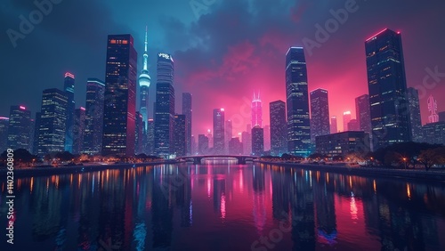 Fototapeta premium Futuristic city skyline with skyscrapers illuminated by vibrant spectrum lights and security holograms reflecting in the water