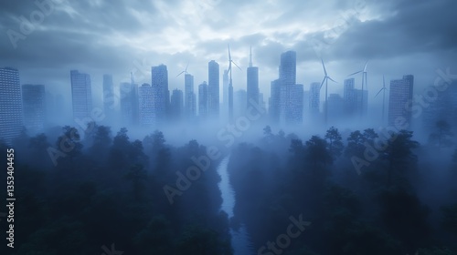 © AhmadTriwahyuutomo, Fototapeta premium Futuristic city skyline with wind turbines surrounded by misty forest and a river.