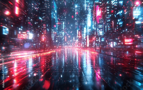 © ABIDZAR ALFAREZ, Fototapeta premium Futuristic city street at night, neon lights reflecting on wet ground.