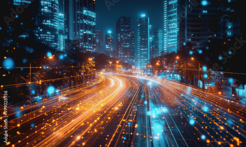 Fototapeta premium Futuristic city street, digital data overlay, neon lights, vibrant...
