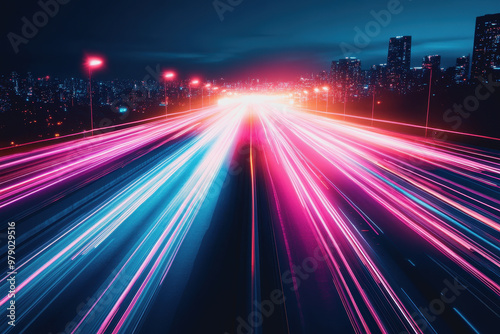 Obraz premium Futuristic city street, digital data overlay, neon lights, vibrant...