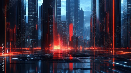 Obraz premium Futuristic city street with glowing red lines, urban background, digital art