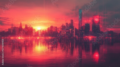 Naklejka premium Futuristic city sunrise, vibrant colors