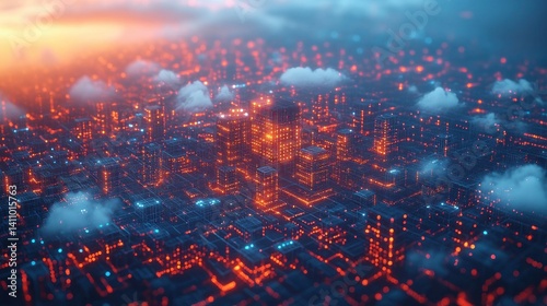 Obraz premium Futuristic city, vibrant lights, aerial view, digital art