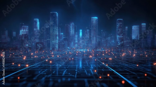 Fototapeta premium Futuristic city with digital grid glowing buildings cyberpunk technology smart network navigation ai data communication security innovation