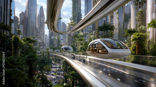 Fototapeta premium Futuristic city with flying vehicles and lush greenery, showcasing advanced...