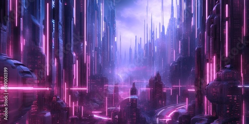 Obraz premium Futuristic city with future digital technology, neon purple banner