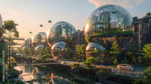 © Emiliia, Obraz premium Futuristic City With Glass Domes