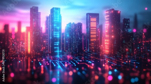 © marcia47, Obraz premium Futuristic city with glowing neon skyscrapers and digital circuit floor