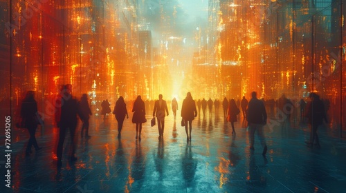 © AlexandraRooss, Obraz premium Futuristic city with silhouettes of people walking. 3D rendering - Generative AI