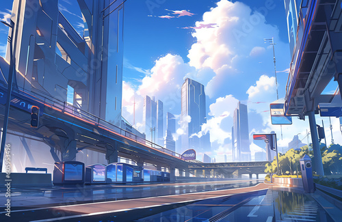 Fototapeta premium futuristic city with sleek buildings, anime art. generative AI