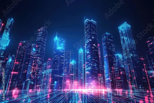 © Onanong, Fototapeta premium Futuristic city with towering skyscrapers and glowing neon lights