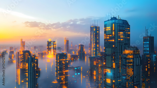 Obraz premium Futuristic Cityscape Above the Clouds at Sunrise