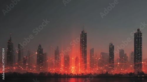© horizon, Fototapeta premium Futuristic cityscape at dusk shows gleaming skyscrapers connected by glowing red neural networks, representing advanced global communication technology.