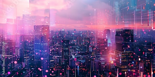 Fototapeta premium Futuristic Cityscape at Dusk with Digital Overlay and Neon Lights