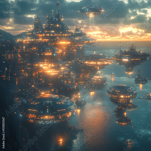 © tanawatbig, Fototapeta premium Futuristic Cityscape at Dusk with Glowing Lights