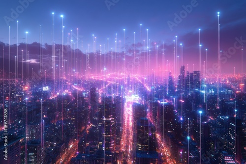 Fototapeta premium Futuristic Cityscape at Dusk with Neon Lines and Smart Technology