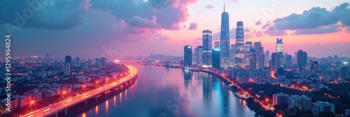 © Kachaphot, Naklejka premium futuristic cityscape at dusk with towering skyscrapers and neon lights reflecting off a sleek white background, sky, futuristic, white