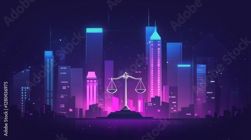 Obraz premium Futuristic Cityscape at Night Featuring Scales of Justice Symbolizing Law and Order in a Vibrant Neon Environment with Dynamic Skyline