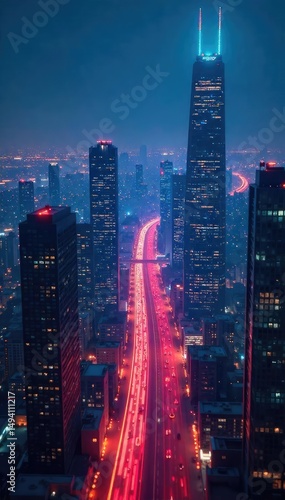 Obraz premium Futuristic cityscape at night, glowing network lines connecting buildings, symbolizing innovative technological connection and progress , information, global