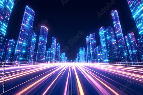 Fototapeta premium Futuristic cityscape at night, glowing skyscrapers flanking a vibrant highway with light trails