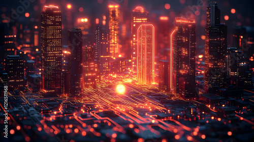 © AgungRikhi, Fototapeta premium Futuristic Cityscape at Night: Glowing Towers and Circuitry