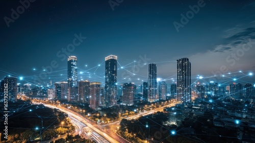 Fototapeta premium Futuristic Cityscape at Night: High-Rise Buildings Connected by Digital Network, Representing Modern Communication and Technology