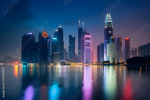 © abdulmoizjaangda, Fototapeta premium Futuristic cityscape at night, neon skyscrapers reflected on tranquil water surface