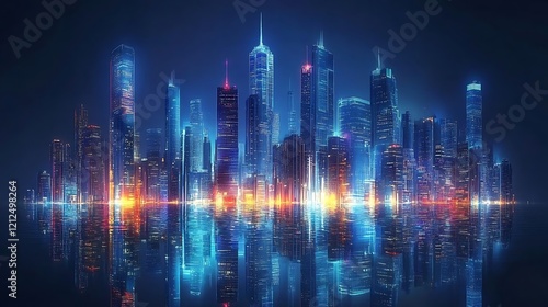 Obraz premium Futuristic cityscape at night, reflected in water.