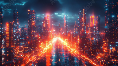 Fototapeta premium Futuristic cityscape at night urban landscape digital art neon lights high...