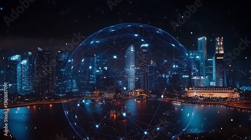 © oris, Fototapeta premium Futuristic cityscape at night with a glowing network sphere.