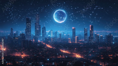 Fototapeta premium Futuristic cityscape at night with digital connections and a large moon.