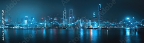 Fototapeta premium Futuristic cityscape at night with digital network overlay.