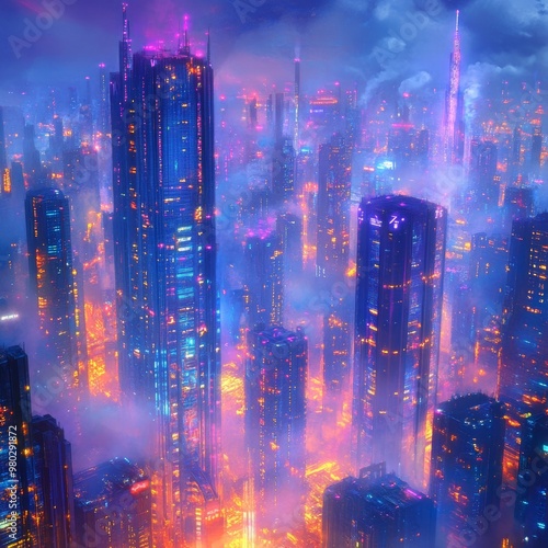 © A4719, Fototapeta premium Futuristic Cityscape at Night with Fog and Neon Lights