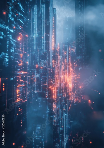 Obraz premium Futuristic cityscape at night with glowing lights and fog.