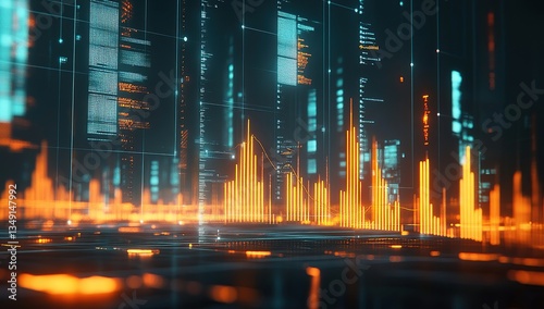 © Selvi, Obraz premium Futuristic Cityscape at Night with Glowing Neon Lights and Digital Data Streams