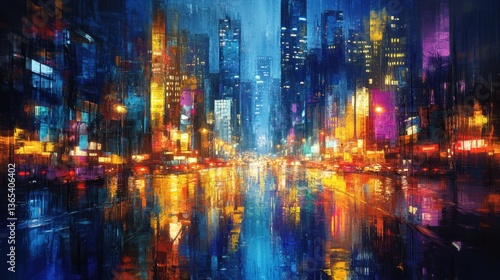 © Nastya, Obraz premium futuristic cityscape at night with glowing neon lights reflecting off wet streets