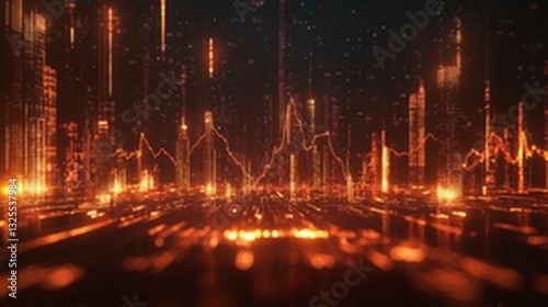 © Arfi Studio, Naklejka premium Futuristic cityscape at night with glowing orange lines and data streams.