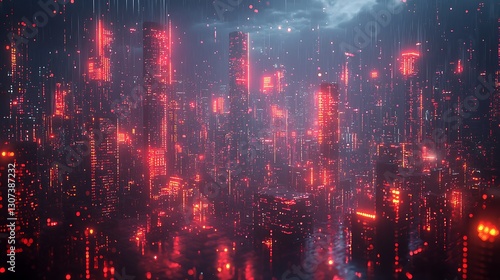 Obraz premium Futuristic Cityscape at Night with Glowing Red Lights and Rain