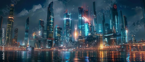 Obraz premium Futuristic Cityscape at Night with Neon Lights