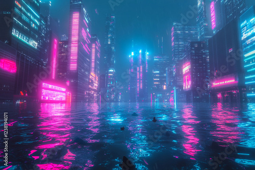 Naklejka premium Futuristic cityscape at night with neon lights and flooded streets under a moody, rainy sky