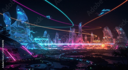 Obraz premium Futuristic Cityscape at Night with Neon Lights and Flying Vehicles, Sci-fi Illustration of Advanced Urban Infrastructure and Technology
