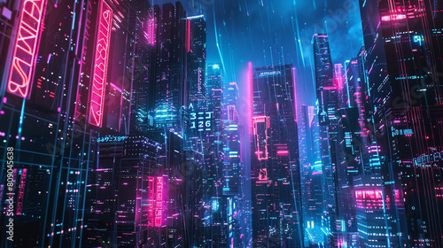 Fototapeta premium Futuristic cityscape at night with neon lights, depicting a large, mysterious...
